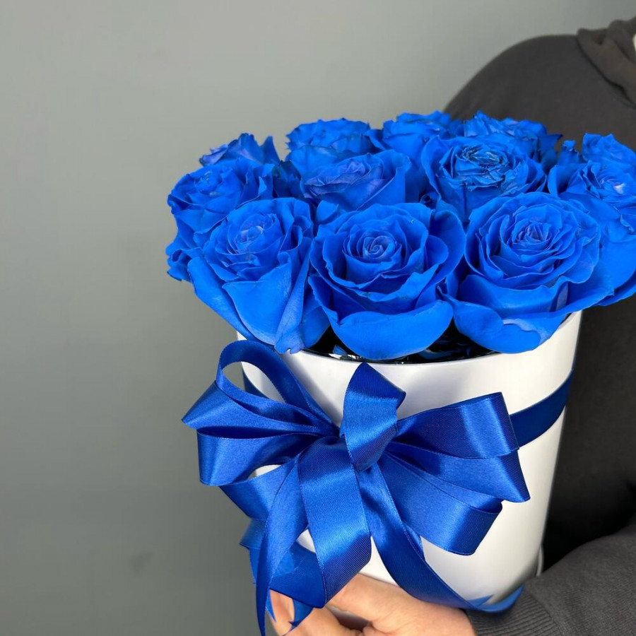 На фото монобукет из 15 синих роз в коробке «ночь и море». В составе: роза (синяя) 15 шт, шляпная коробка (s) 1 шт, атласная лента 2 шт, . Все цветы свежие и ароматные, букет красиво оформлен и отлично подходит для подарка. Доступна доставка цветов или самовывоз.