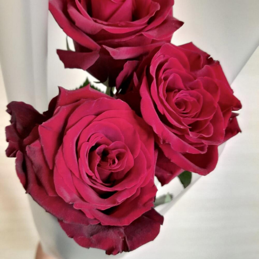 На фото букет из 3 бордовых роз. В составе: роза 3 шт, дизайнерская упаковка 1 шт, атласная лента 1 шт, . Все цветы свежие и ароматные, букет красиво оформлен и отлично подходит для подарка. Доступна доставка цветов или самовывоз.