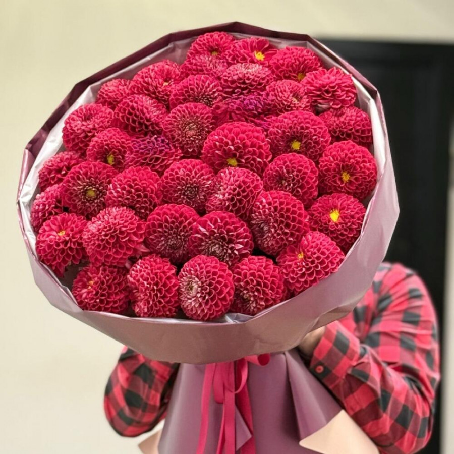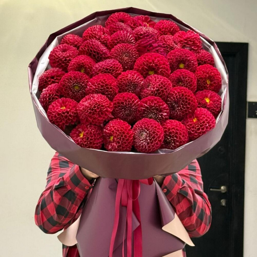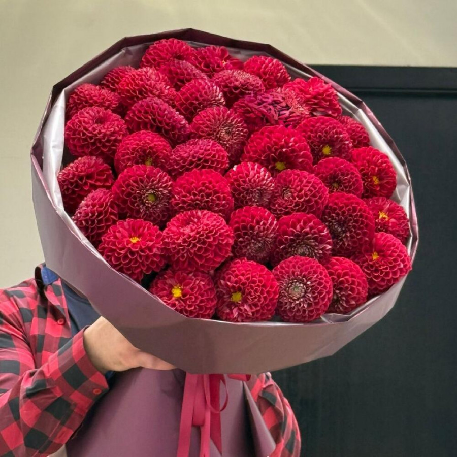 На фото букет из 39 красных георгин. В составе: георгина 39 шт, дизайнерская упаковка 2 шт, атласная лента 1 шт, . Все цветы свежие и ароматные, букет красиво оформлен и отлично подходит для подарка. Доступна доставка цветов или самовывоз.