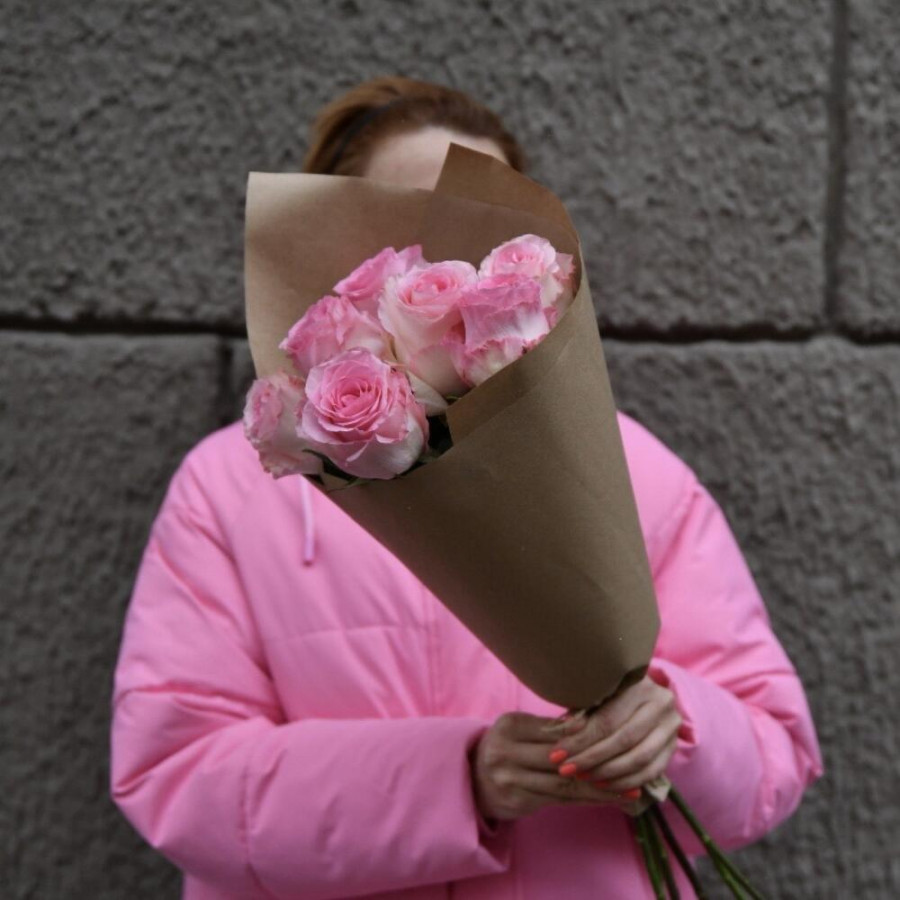 На фото букет из 7 розовых роз. В составе: роза 7 шт, дизайнерская упаковка 1 шт, атласная лента 1 шт, . Все цветы свежие и ароматные, букет красиво оформлен и отлично подходит для подарка. Доступна доставка цветов или самовывоз.