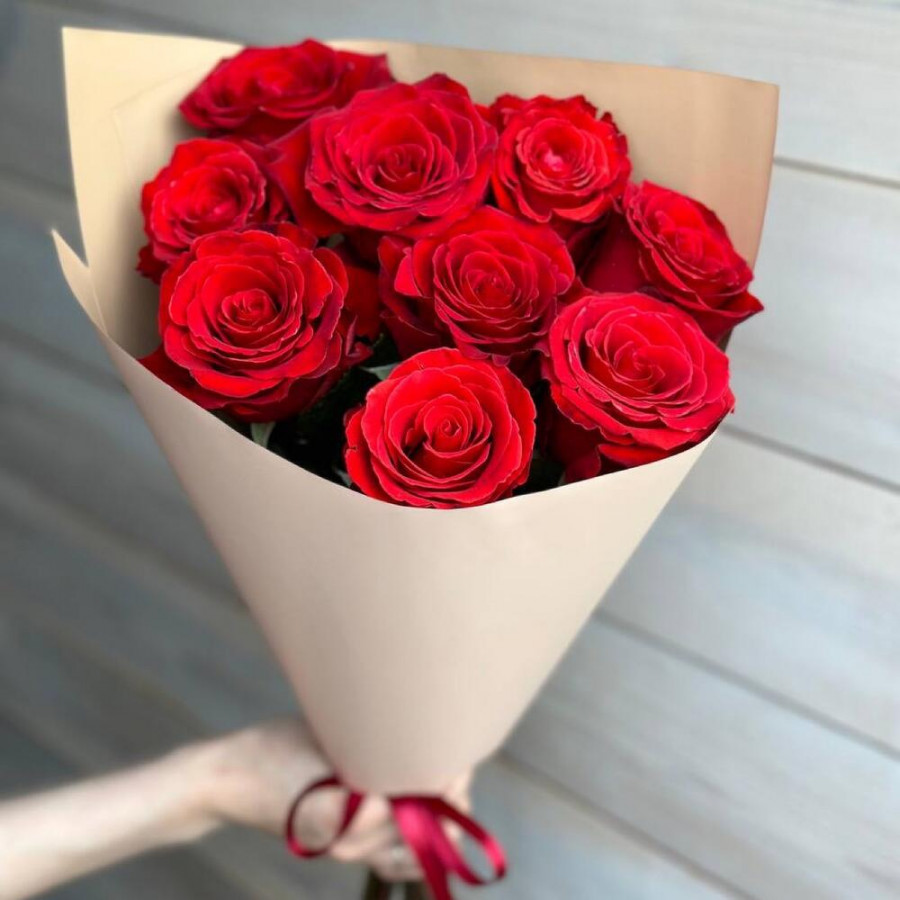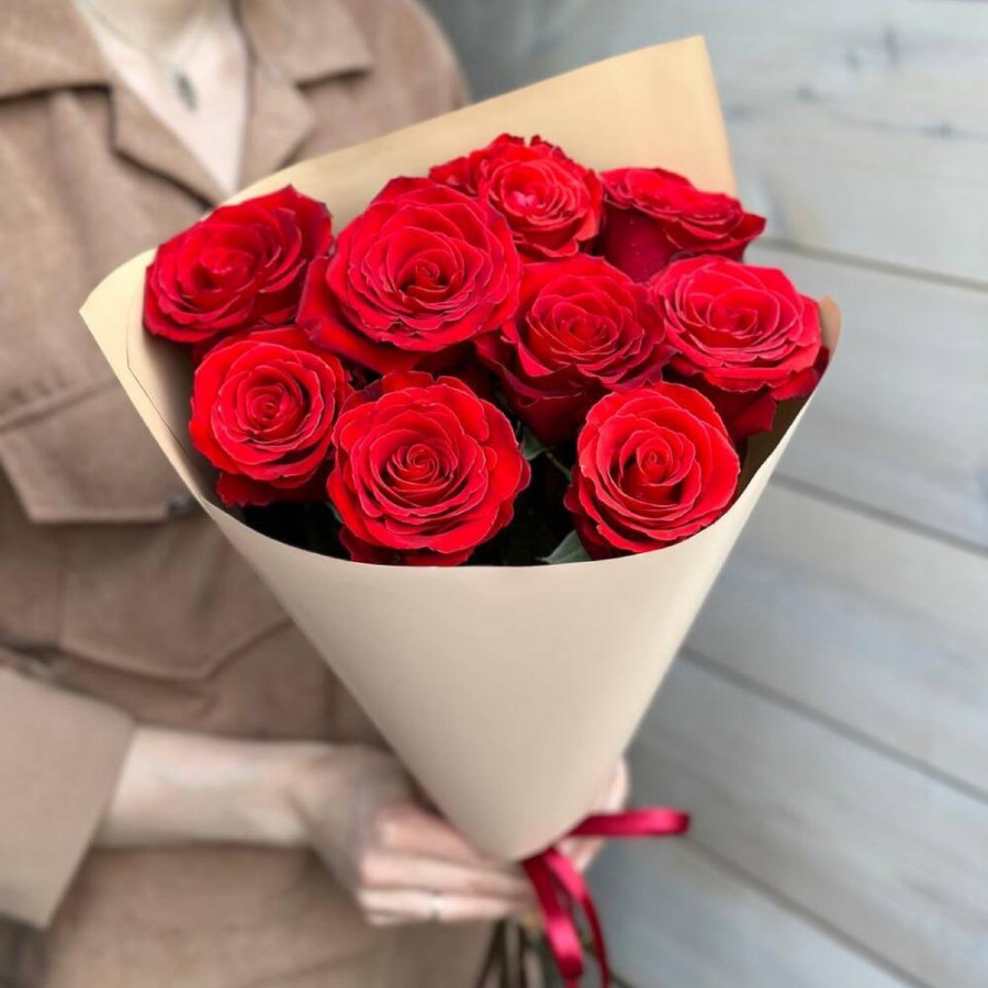 На фото букет из 9 красных роз. В составе: роза 9 шт, крафт-бумага 1 шт, атласная лента 1 шт, . Все цветы свежие и ароматные, букет красиво оформлен и отлично подходит для подарка. Доступна доставка цветов или самовывоз.