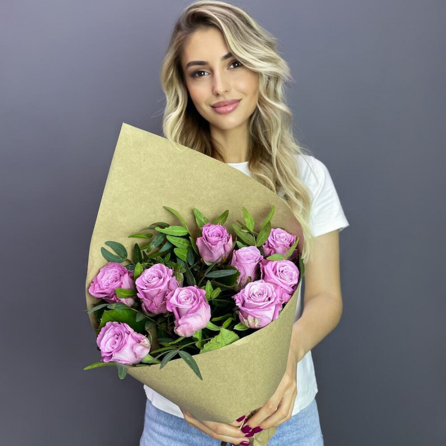 На фото букет из 9 сиреневых роз. В составе: роза 9 шт, писташ 3 шт, крафт-бумага 1 шт, атласная лента 1 шт, . Все цветы свежие и ароматные, букет красиво оформлен и отлично подходит для подарка. Доступна доставка цветов или самовывоз.