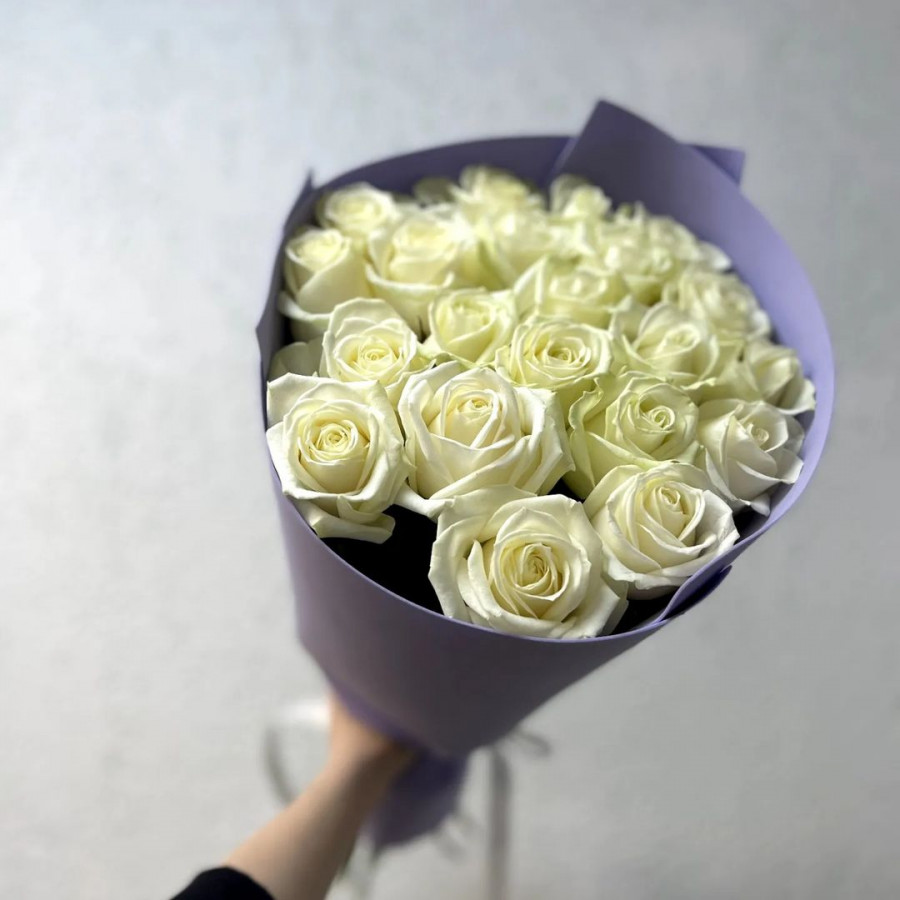 На фото букет из 23 белых роз. В составе: роза 23 шт, крафт-бумага 1 шт, атласная лента 1 шт, . Все цветы свежие и ароматные, букет красиво оформлен и отлично подходит для подарка. Доступна доставка цветов или самовывоз.