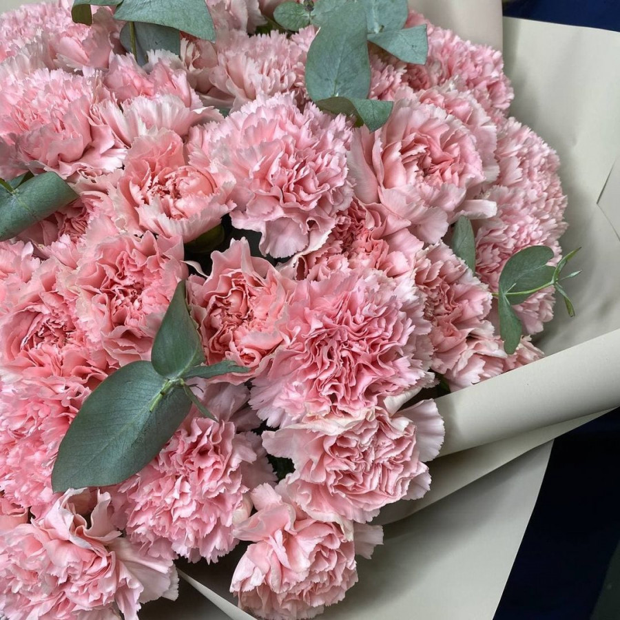 На фото букет из 55 розовых гвоздик. В составе: гвоздика 55 шт, крафт-бумага 1 шт, атласная лента 1 шт, . Все цветы свежие и ароматные, букет красиво оформлен и отлично подходит для подарка. Доступна доставка цветов или самовывоз.