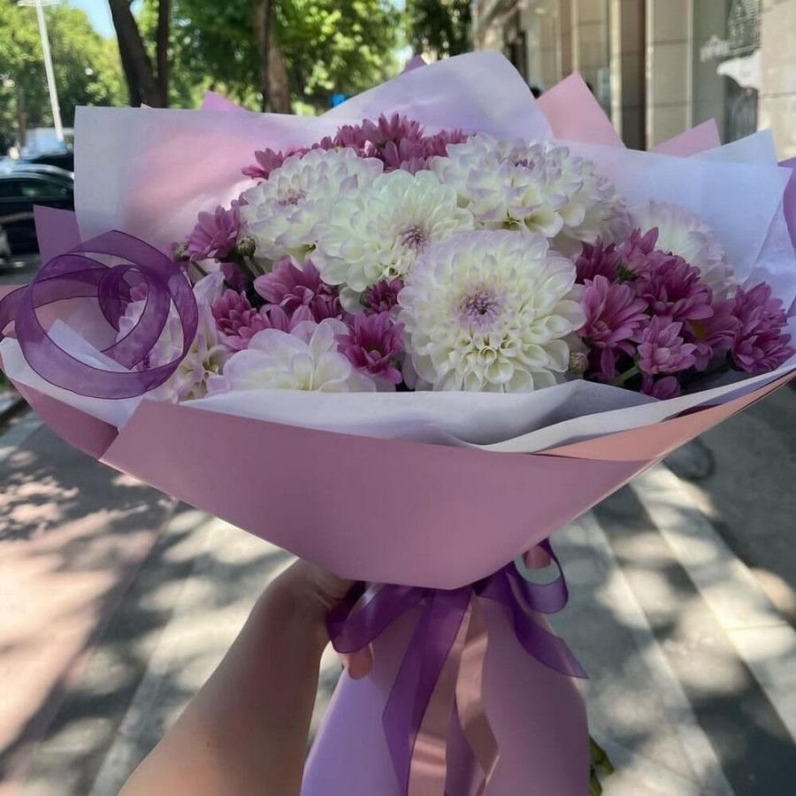 На фото букет из георгин и хризантем. В составе: георгина 9 шт, хризантема кустовая 5 шт, дизайнерская упаковка 2 шт, атласная лента 1 шт, . Все цветы свежие и ароматные, букет красиво оформлен и отлично подходит для подарка. Доступна доставка цветов или самовывоз.