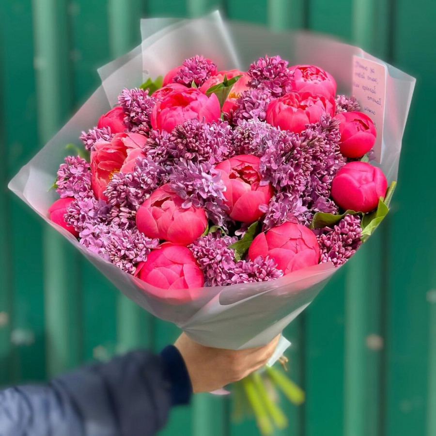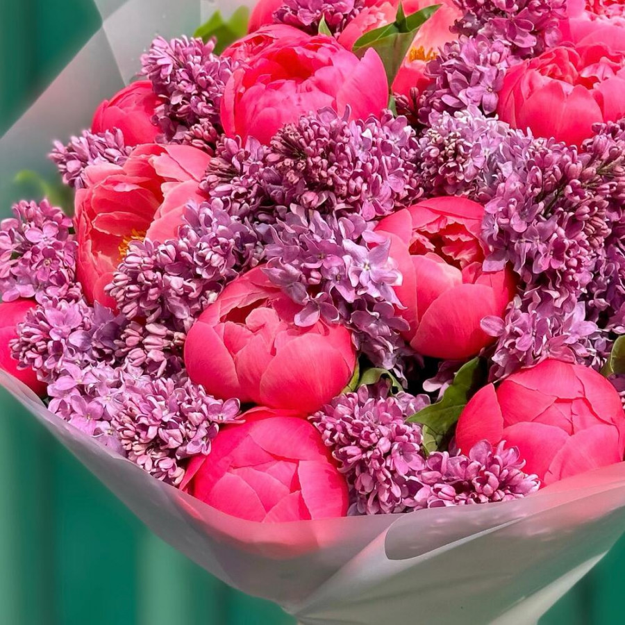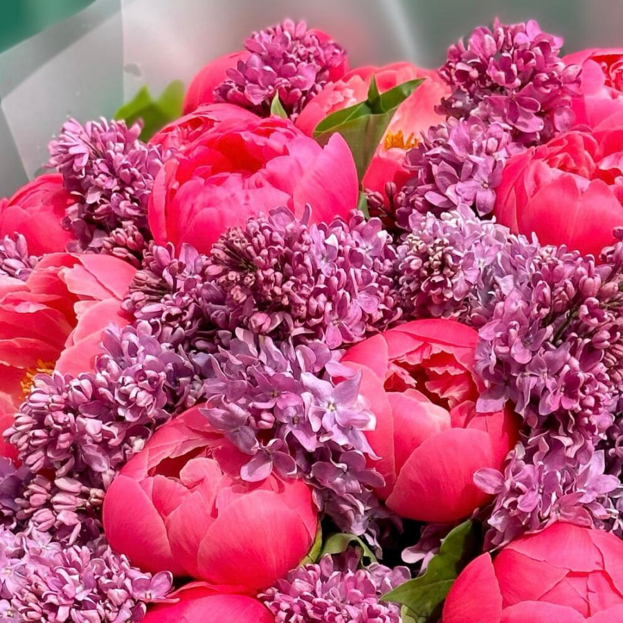 На фото букет сирени и коралловых пионов. В составе: сирень 10 шт, пион 15 шт, дизайнерская упаковка 2 шт, атласная лента 1 шт, . Все цветы свежие и ароматные, букет красиво оформлен и отлично подходит для подарка. Доступна доставка цветов или самовывоз.